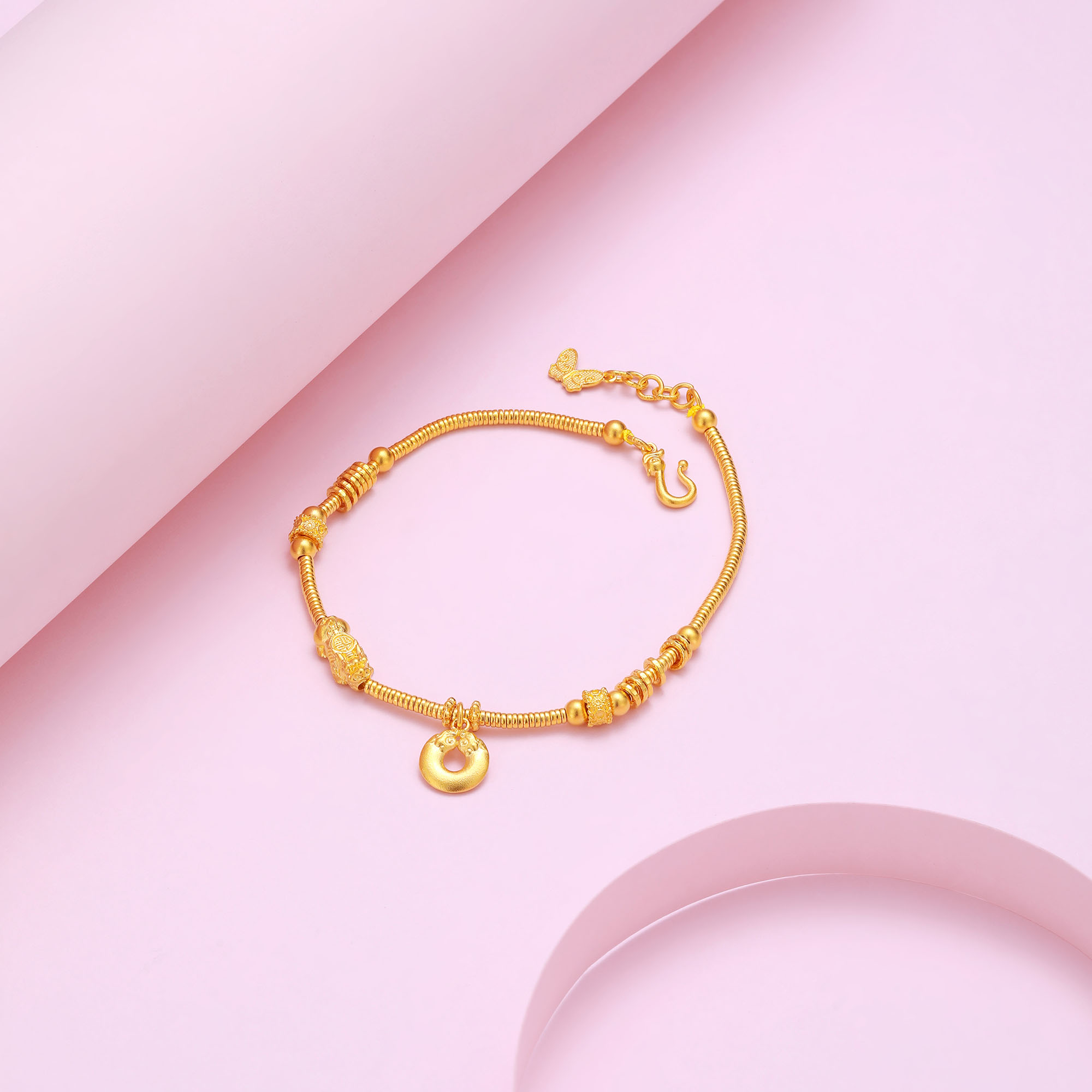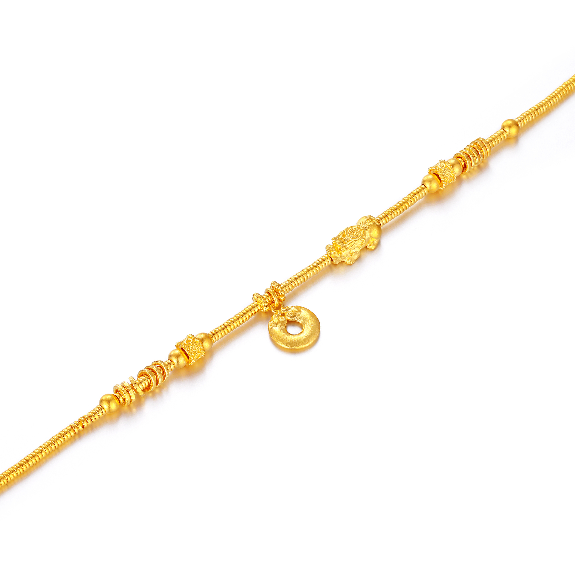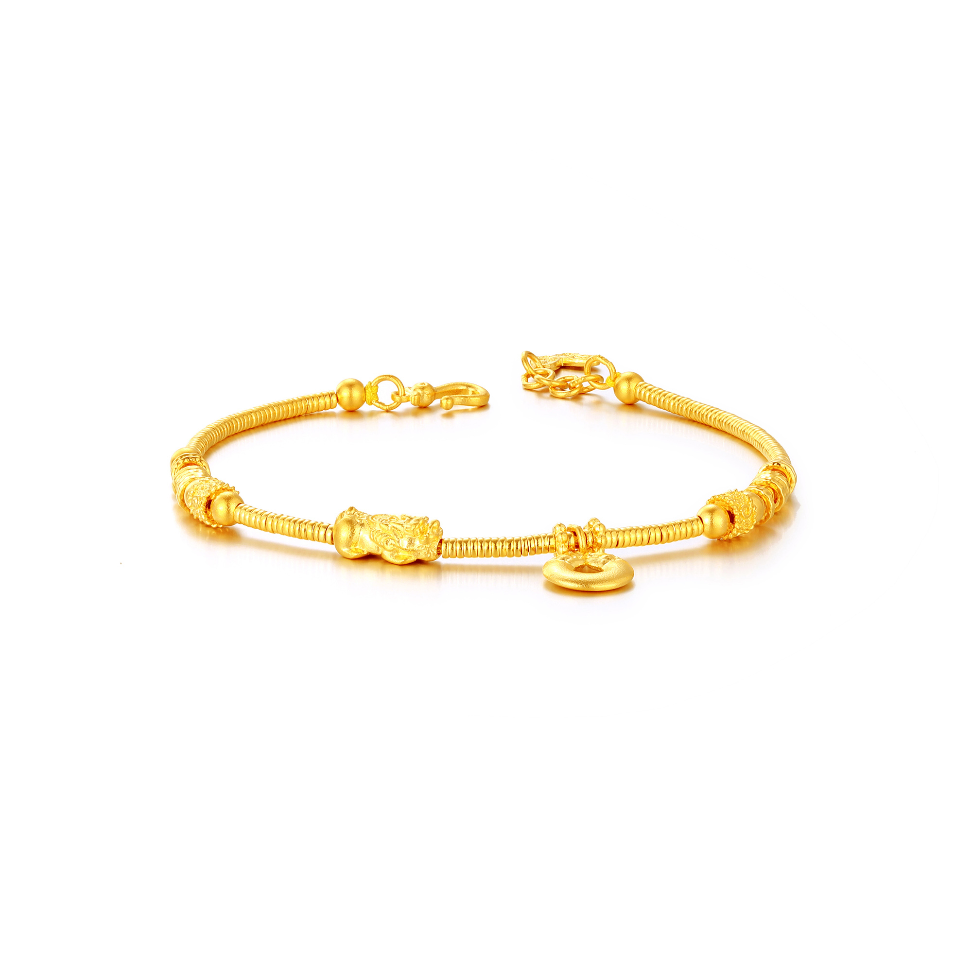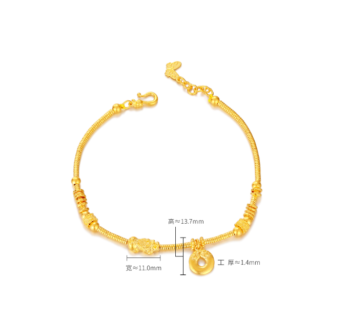 采用中国传统的古法工艺制成色泽古朴,温润庄重精雕细琢,凸显黄金细腻质感佩戴黄金盘缠手串可以招来好运和幸福让人事事顺心、如意吉散发着迷人而璀璨的光芒佩戴于腕,将福禄、财富、幸福紧紧系于身旁尽显优雅品味与美好祈愿质感十足,既显高级又不失优雅