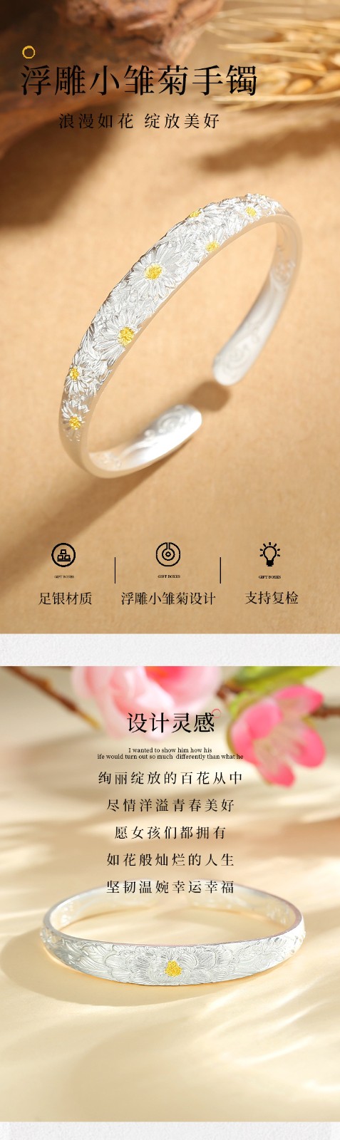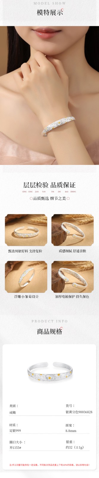 纯银小雏菊手镯女高级感新中式浮雕实心开口999银镯子新年送妈妈90036828-YG